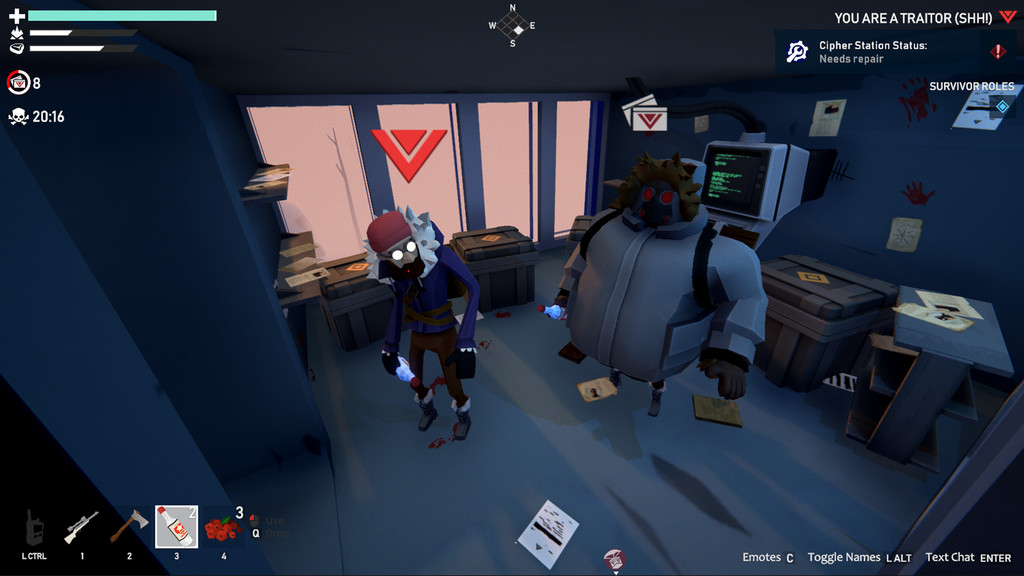 背叛者的人数比幸存者少,而且他们在游戏刚开始时势单力薄,但他们可以渗透幸存者阵营并赢得他们的信任,同时积累自己的实力。幸存者永远不能百分之百地确定谁是可以信赖的人。背叛者可能会利用这一点:散布谎言,怂恿幸存者内斗。