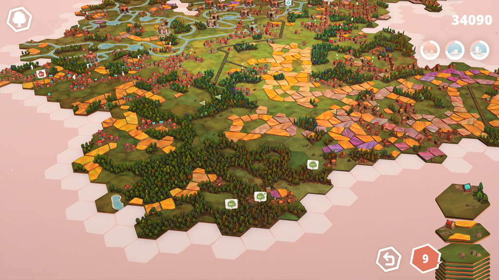 在《筑梦颂》游戏开始时你会得到一叠程序化生成的地景板块,从最上层开始抽取板块,选择想放置的未开发区域,旋转调整最佳的位置来组合创造不同规模的村落地形如森林,小镇和河流来获取高分。