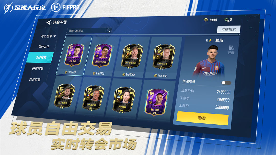《足球大玩家》是你在手机平台能体验到的最紧张刺激的足球游戏,来和其他玩家进行实时PVP对战吧!在这里你能获得媲美主机的足球游戏体验,甚至可以和你的好友立刻进行一场面对面的对战。 游戏特点 与玩家实时在线对战 用你组建的队伍,与其他玩家进行实时对战。磨炼你的技巧来面对世界上其他强大的对手吧。 媲美主机的画面效果 60帧高帧率,高清真实模型,构成了最真实的足球比赛过程。射门、盘带、抢断、传球,均基于动作捕捉技术制作,你能在这里获得最佳的临场体验。 收集养成球员,将你的足球理念注入阵容 游戏包含FIFPro授权提供的数千名真实球员,无论是梅西与C罗,还是刚刚暂露头角的新秀,都能够在你的阵容中大放异彩。 真正的球员交易市场 与其他玩家在交易市场中进行实时的自由球员交易,而不是面对一个虚假的系统商店。通过你的技巧赢的转会费,在市场上购买你的心仪球员。