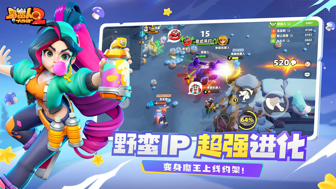 嗨,还记得大胡子巴巴六吗?融合竞技与冒险的魔性乱斗手游《野蛮人大作战2》来啦! 逗趣搞怪的野蛮人英雄,魔性奇葩的道具宠物; 经典3v3v3乱斗创意新篇章,欢乐竞技全程高能根本停不下来! 准备好了吗,化身野蛮人酋长巴巴六,一起在充满欢乐的野蛮世界开启乱斗之旅吧! 游戏特色: 【3v3v3即时乱斗,魔性战斗停不下来!】 游戏继承《野蛮人大作战》的3v3v3经典玩法和搞怪逗趣的角色形象,一言不合就尬舞。单局5分钟,即开即打。多阵营乱斗,酣畅淋漓。丰富的随机性,让每一场战斗都充满未知的刺激。吃吃吃,砍砍砍,欢乐无穷超乎想象!千万别捡魔盒! 【打倒菇霸化身魔王,可别被吃掉!】 化身无情的蘑菇收割机,你可以发育打架,嗨翻全场,也可以偷菇阴人,秀出操作!凶恶的大菇霸会在战场随机出现,打倒它,你就能变身大魔王成为全场焦点,但是要当心,可别被大蘑菇一口吞掉! 【随机技能,每场不一样!】 单局游戏技能随机,任你挑选。呼啸的龙卷风席卷全场、跳动的雷霆电翻一切、阴险的地刺寸草不生、贴心的鸡腿让你想家。没有最强的套路,只有最邪的打法!打造专属流派,秀出你的骚操作! 【奇怪的野蛮物种,很内涵!】 背起肉串、扛起鸡腿、骑着巨龙,准备出发!——别误会,我们可不是去野餐,而是去打架的!仙人球棒、鲨鱼剑、蜥蜴斧、不能捡的魔盒,奇怪的东西数不胜数。如果你不喜欢榴莲,那比赛一定要卖力点!当听到动感的音乐,请原谅野蛮人尴尬的舞蹈,太上头了! 【试炼挑战困难关卡!】 前方一大波怪物正在靠近!即使在孤立无援的小岛也要甩开膀子干呀!在炫酷的技能加持下抵御怪物的波波侵袭,是坚守阵地屹立不倒还是主动出击鏖战群雄,多样的技能搭配打造不一样的自己!
