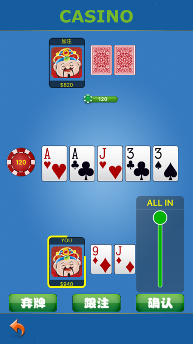我们的智能AI能根据自己的手牌和公共牌的情况,精确判断出自己当前的胜率,并根据自己的胜率以及玩家的跟注加注情况来作出是跟注还是加注还是看牌亦或是弃牌等处理!