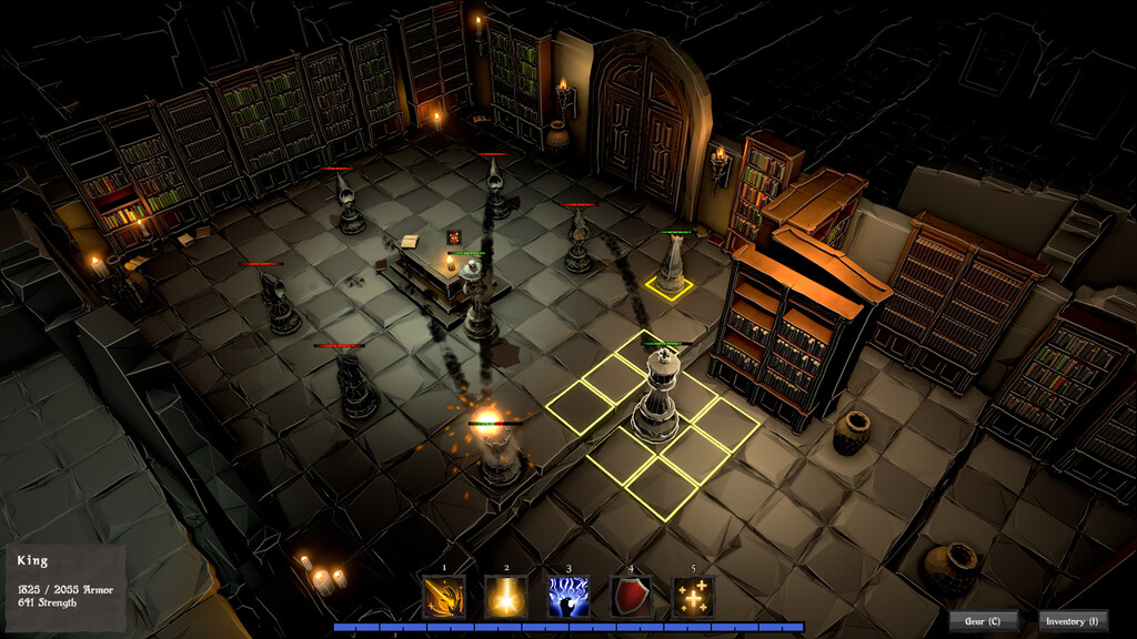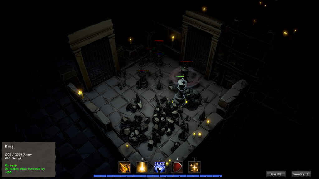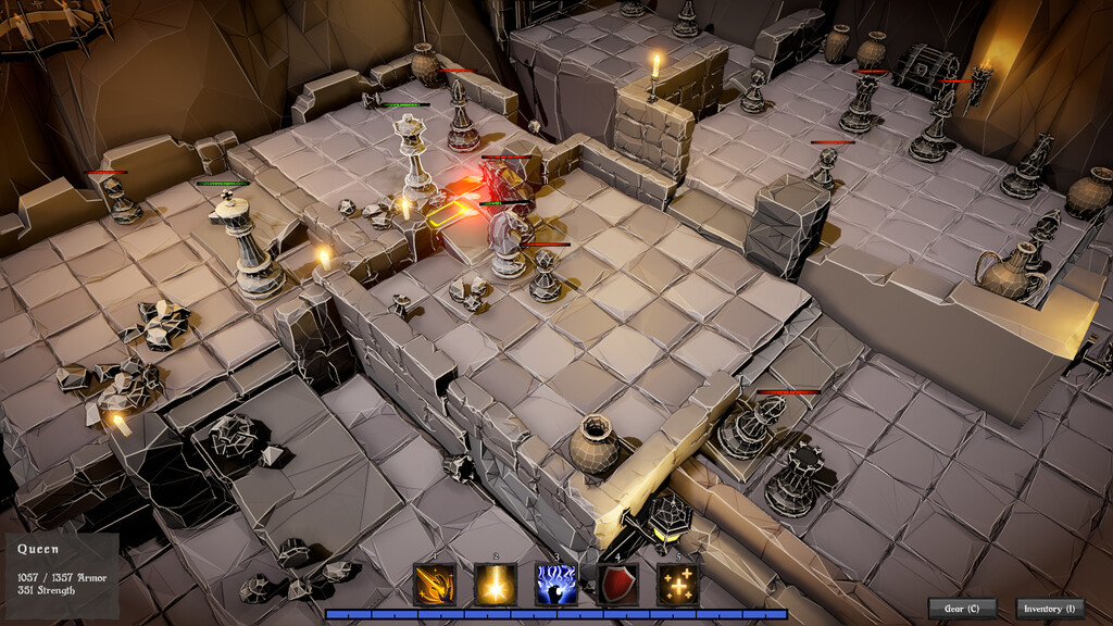 Try to keep your chess pieces alive though these first four levels of a dark dungeon. Build up your army by adding units after every completed room and equip them with weapons. Demo ends with a huge fight,