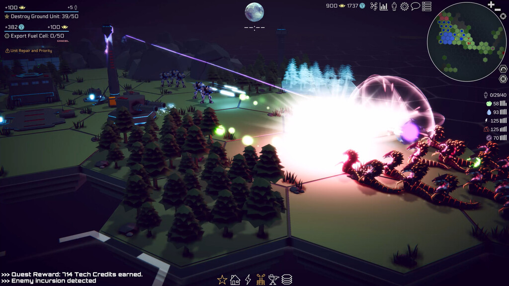 A constant stream of fuel cells and raw resources are needed to keep your defenses functioning and your colonists fed. Collect, refine, and process resources. Fuel cells and ore are needed for buildings and colonists need water and food. As your population grows you can support more and more buildings.