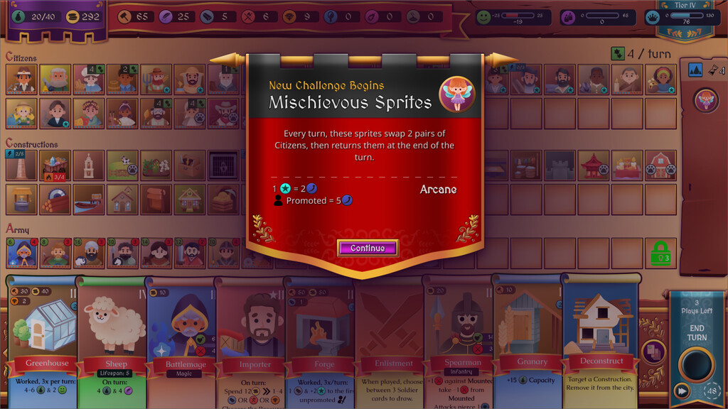 In this demo, you'll be able to reach Tier 2 (out of 5) and see how the game changes with new cards and new Kingdom dynamics. Manage Criminals sneaking into your Kingdom, as well as enemy Invaders attacking your lands. Replace old cards, or find new ways to use them for various synergies.