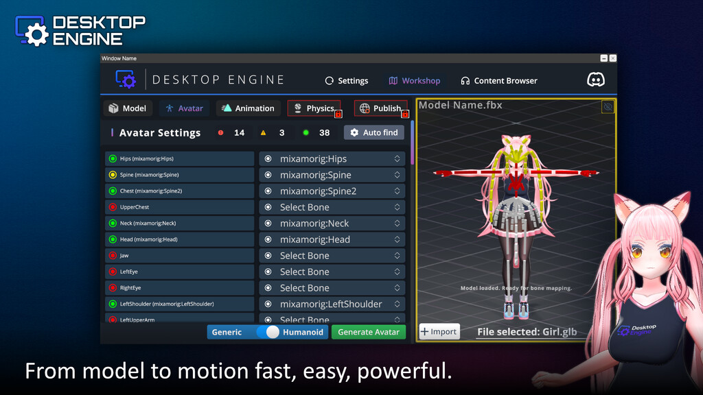 由于支持 VRM,通过 VRoid Studio 等平台创建的角色无需额外转换即可直接在 Desktop Engine 中使用。