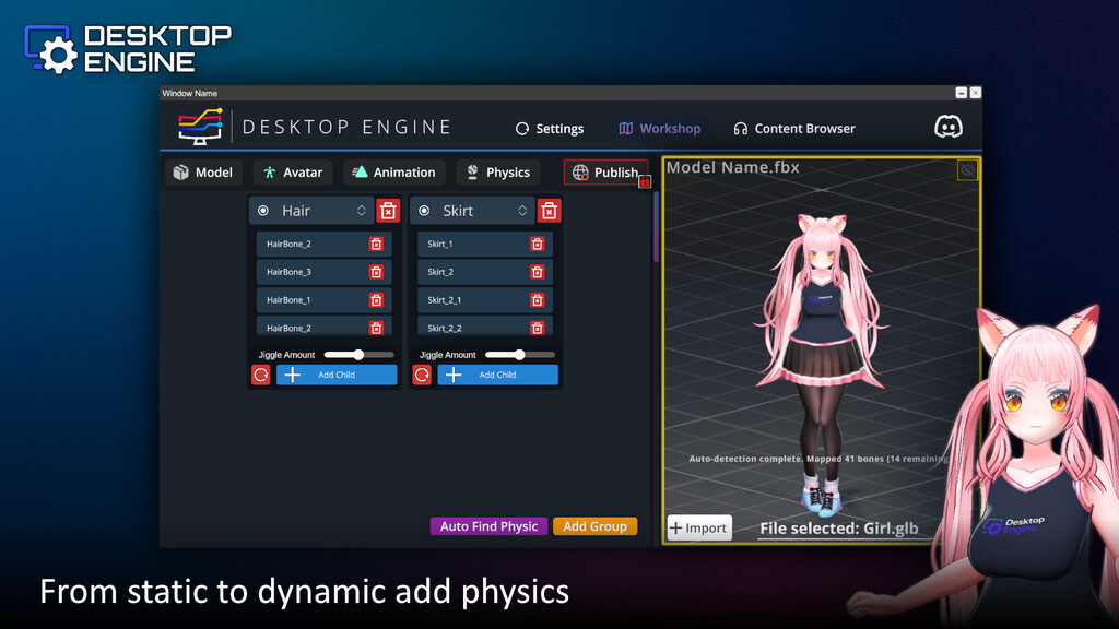 Desktop Engine 是一款创新软件,重新定义了桌面体验,能够实时运行 2D 和 3D 角色、聊天窗口、头像系统以及其他交互式元素。无论您是主播、玩家,还是仅仅想要个性化桌面的用户,Desktop Engine 都能为所有人提供一个生动、可自定义且互动的桌面环境。