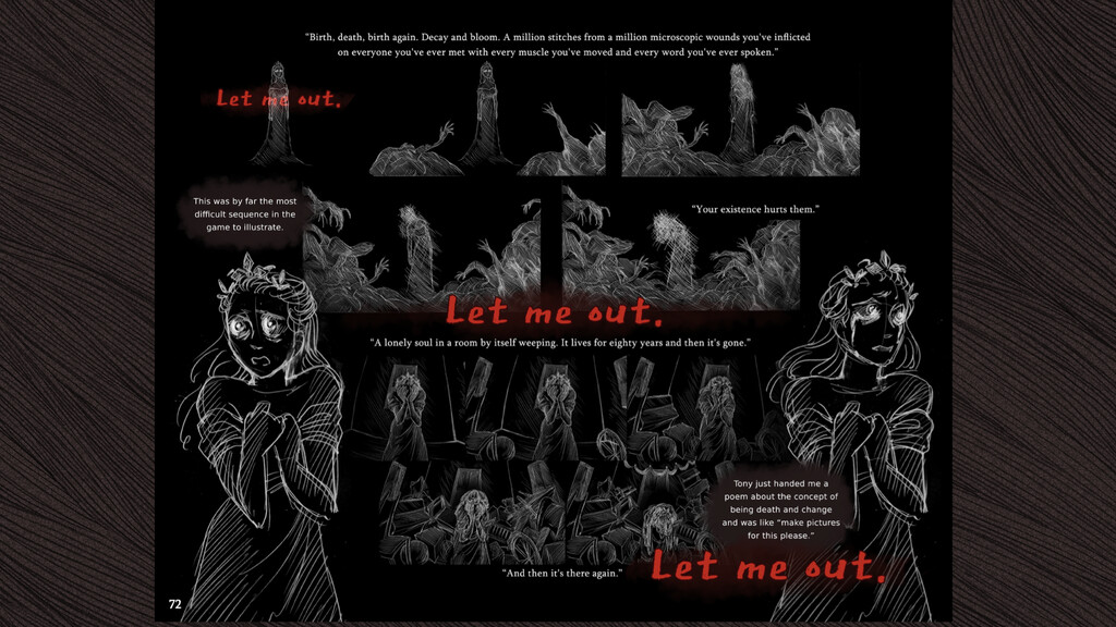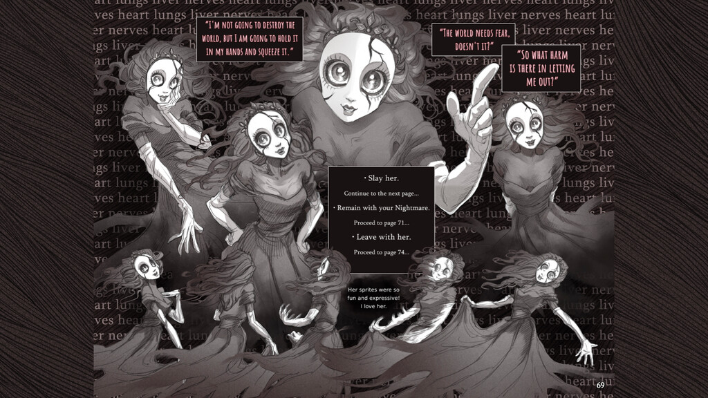 The Art of Slay the Princess is an interactive artbook that allows you to pick your paths through the story of Slay the Princess, complete with concept art and developer commentary.